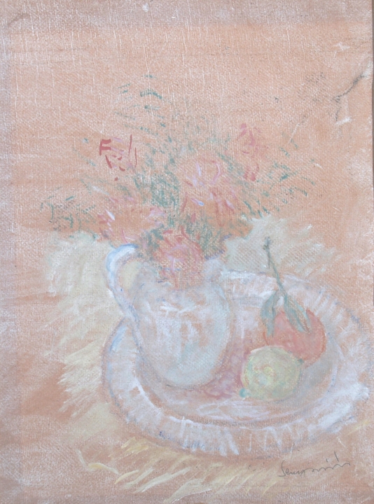 "Fiori" anni 1954/1956 Olio su tavola cm. H: 44.00 L: 33.00 Etichetta al retro: Galleria d'Arte Trieste (Trieste). Certificato di autenticità rilasciato dalla Fondazione P. Semeghini in data 18-10-2011.