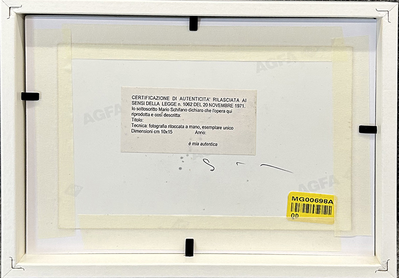 MARIO SCHIFANO, Senza titolo, 1990-1997, fotografia dipinta a mano, dim. 10x15 cm. Al verso: scheda descrittiva e firma dell'autore. Opera archiviata presso l'Archivio generale dell'Opera di Mario Schifano al N°F90-97/6860 in data 05/10/2007 a Roma. Opera pubblicata sul Catalogo Fondazione M.S Multistudio alla pag. 301 del volume V e sul Catalogo Fotografie Ritoccate alla pag. 98 del volume I. Opera con cornice