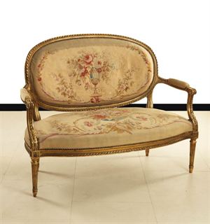 DIVANO Divano in legno dorato in stile Luigi XVI, epoca XIX secolo H 40 123x65 cm Sofa in gilt wood Louis XVI style, vintage nineteenth century