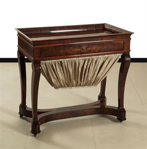 TAVOLINO DA LAVORO Tavolino da lavoro lastronato in piuma di mogano con intarsi in acero poggiante su ruote, Francia epoca Carlo X H 76 82x48 cm A fine mahogany work-table in veneer with maple inlays resting on wheels, France Charles X era