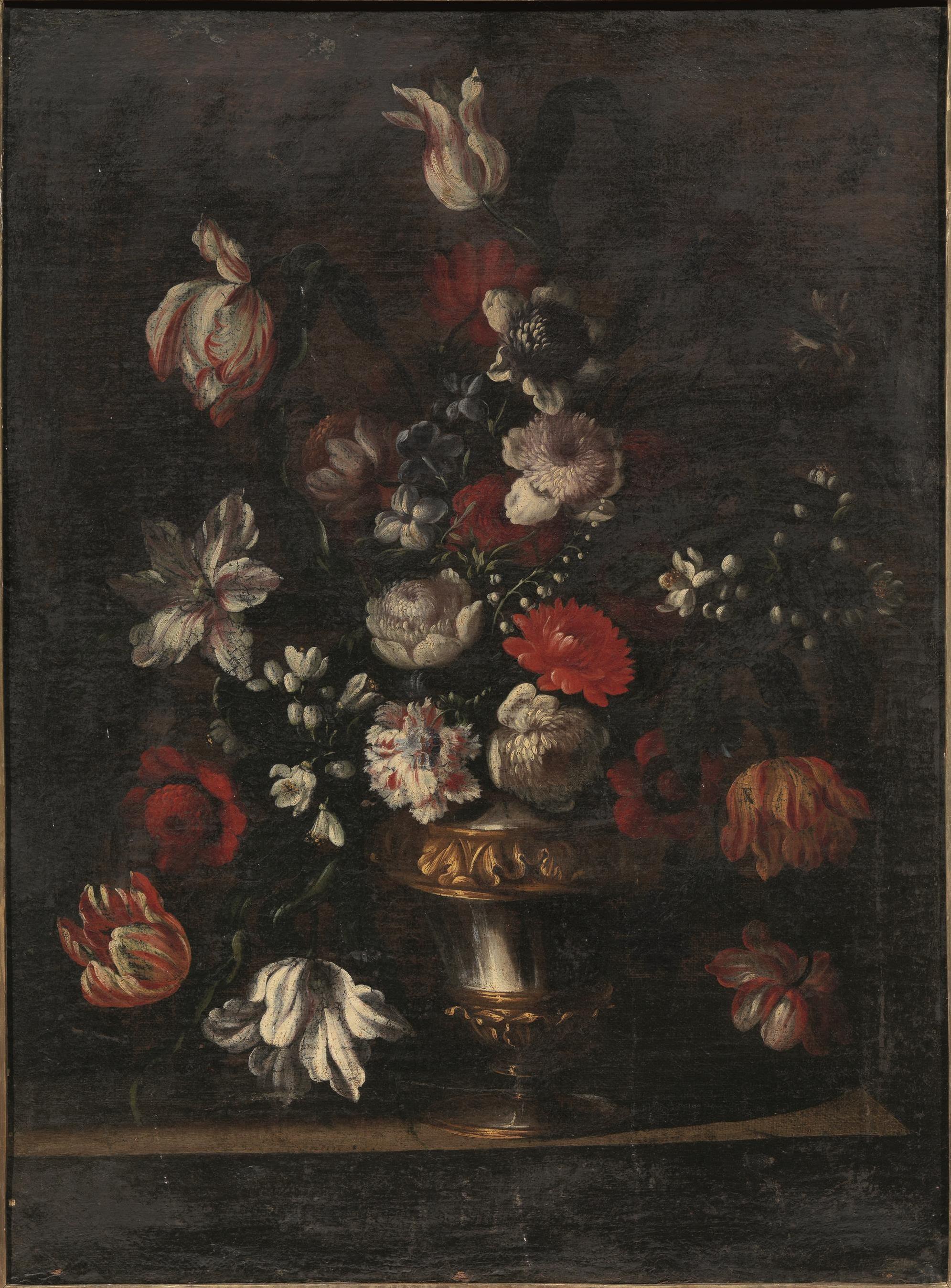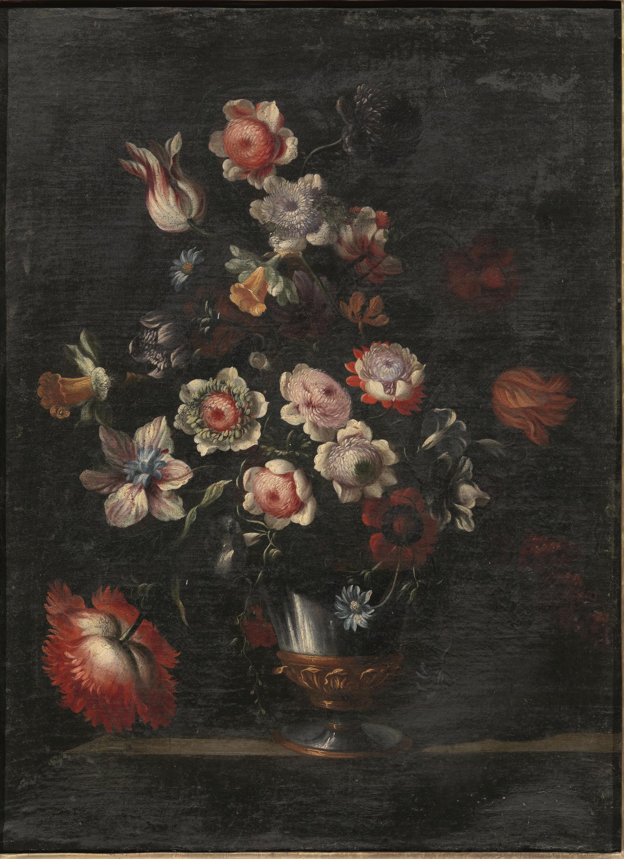 Scuola romana, sec. XVIICOMPOSIZIONI FLOREALI ENTRO VASI IN METALLOcoppia di...
