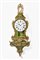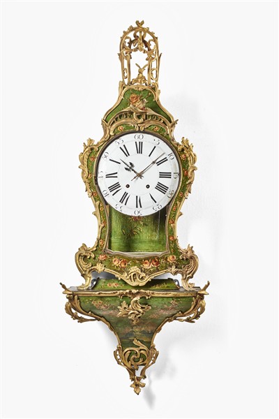 Pendola del tipo Neuchateloise laccata nei toni del verde a decori floreali e fregi in bronzo, quadrante in smalto bianco a numeri romani per le ore e arabi per i minuti, movimento a due treni con suoneria delle ore e dei quarti su campanello. Francia, metà del secolo XVIII