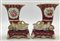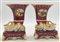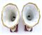 Manifattura francese, secolo XIX. Coppia di vasi a cornucopia con attaccature a cigno in porcellana dipinta in policromia a mazzi fioriti e scene bucoliche entro riserve su fondo rosso e profili in oro, basi sagomate con piedi a ricciolo (h cm 22,5) (difetti e sbeccature)