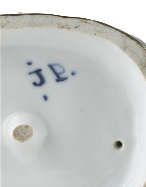 Manifattura Jacob Petit, secolo XIX. Figura in porcellana dipinta in policromia raffigurante un cacciatore con cappello, gerla e fucile poggiante su zolla rocciosa. Marcato JP sotto la base (h cm 28) (difetti, rotture e mancanze)