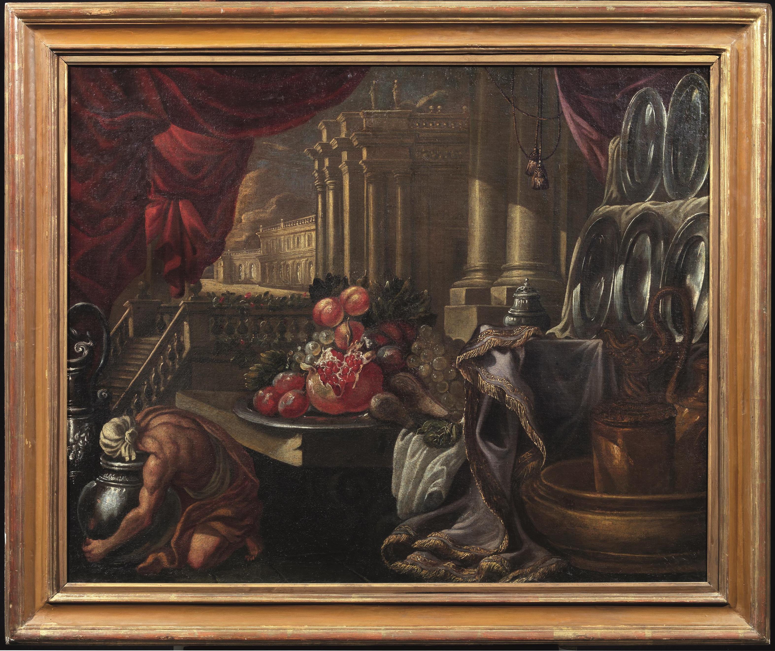NATURA MORTA CON VASSOIO DI FRUTTA E PIATTAIA SULLO SFONDO DI UN’ARCHITETTURA