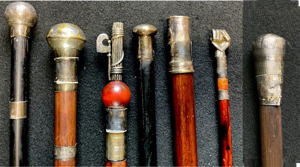 Lotto di sette bastoni da paesaggio con ghiere in argento e prese di forme e de