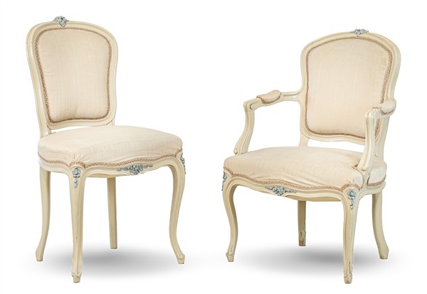 Lotto composto da una poltrona ed una sedia in legno dipinto in policromia (dif