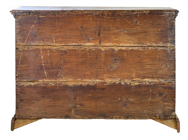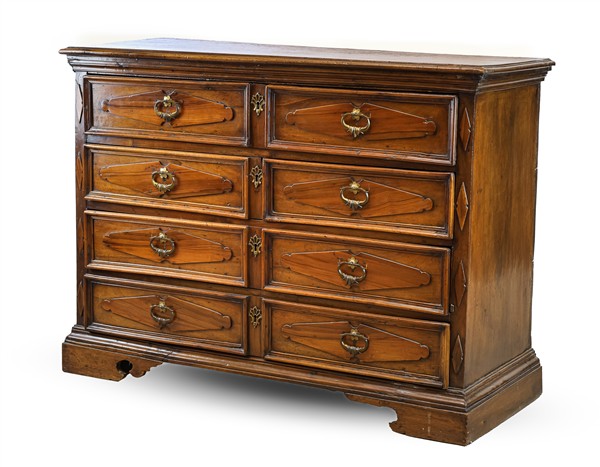 Canterano in noce a quattro cassetti pannellati e riquadrati decorati con motivi romboidali, piedi a mensola. Secolo XVII (cm 134x100x51) (difetti e sostituzioni)