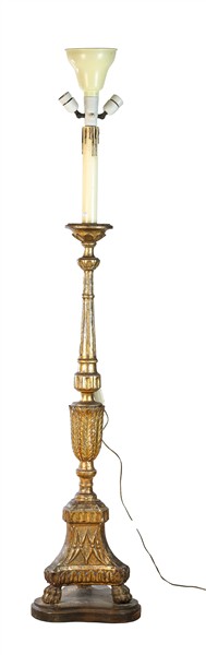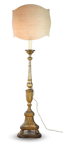 Torciera in legno intagliato a foglie d'acanto, scanalato e dorato (h cm 124) montato a luce elettrica in epoca posteriore, con paralume (difetti)