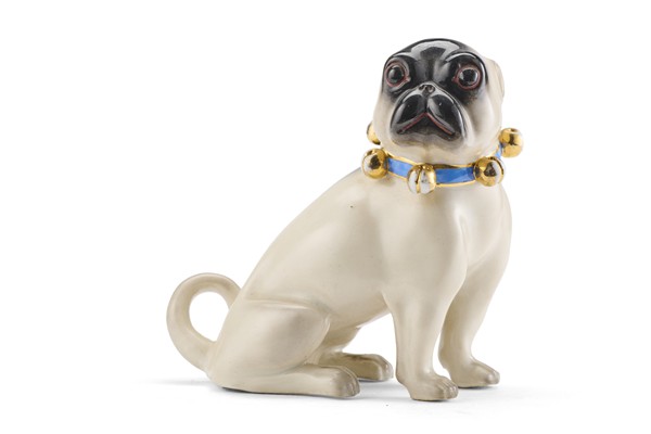 Manifattura del secolo XX. Da un modello di Meissen da Johann Joachim Kaendler. Carlino con collare blu con sonagli in porcellana policroma (h. cm 13,5) (difetti)