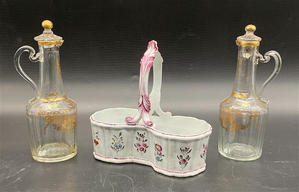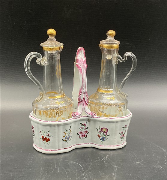 Manifattura Ginori, Doccia, fine secolo XVIII. Portampolle in porcellana dipinta in policromia "al mazzetto" con presa ad arco. Doppia ampolla con tappo in vetro con decori in oro (h tot cm 20) (difetti)
