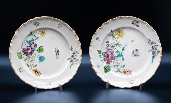 Manifattura francese, probabilmente Bordeaux, secolo XVIII. Coppia di piatti in maiolica a profilo mistilineo dipinti in policromia con decoro floreale e farfalle. Iscritti al retro N 7 in pruno manganese (d cm 24) (difetti e sbeccature)