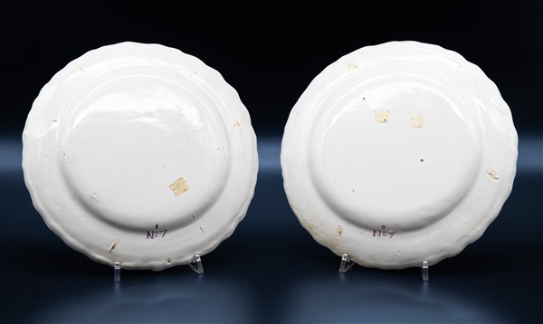 Manifattura francese, probabilmente Bordeaux, secolo XVIII. Coppia di piatti in