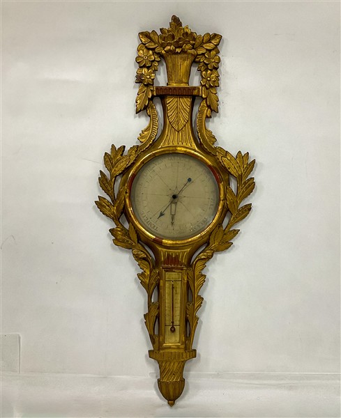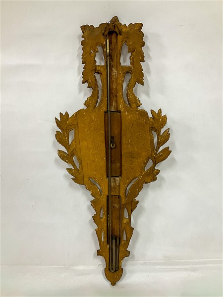 Barometro a mercurio con termometro a stelo, cassa in legno intagliato e dorato. Francia, fine secolo XVIII (h. cm 93) (difetti e mancanze)