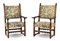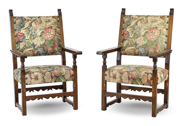 Coppia di seggioloni in legno intagliato, sedute e schienale rivestiti in tessu