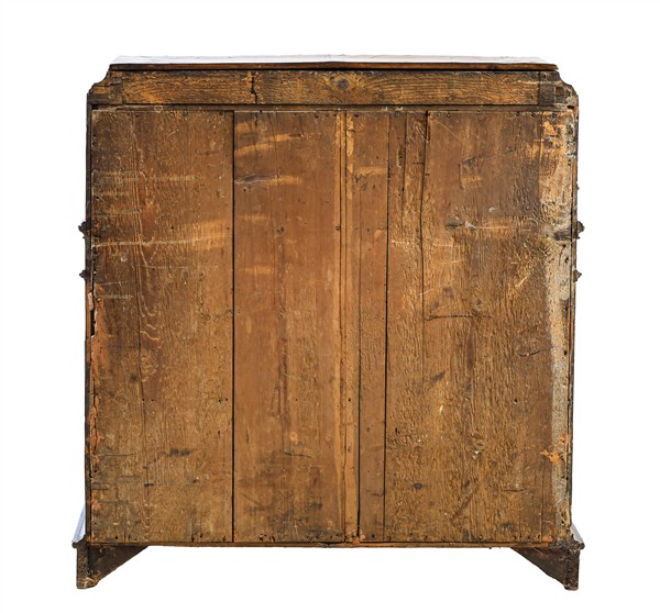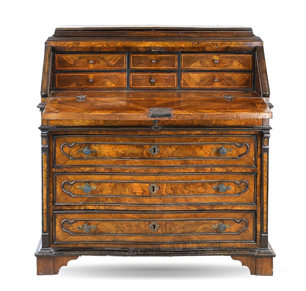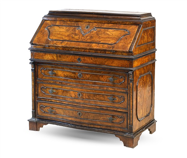 Ribalta lastronata in noce e radica di noce con profili ebanizzati, fronte lievemente mosso a tre cassetti e uno piccolo sotto piano, calatoia celante sei tiretti, piano superiore sollevabile celante doppio vano, piedi a mensola. Lombardia, secolo XVIII (cm 105x108x53) (difetti e restauri)