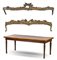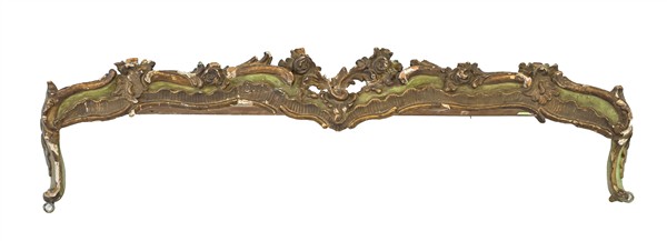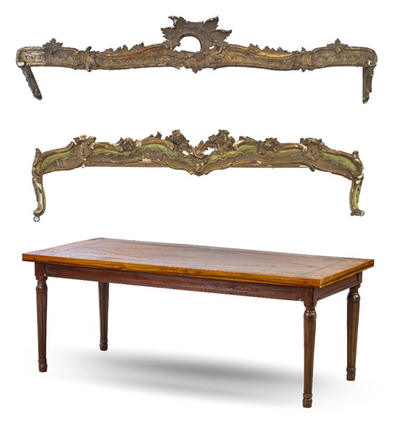 Lotto composto da due mantovane in legno intagliato e traforato a rocailles con tracce di policromia e dorature (L. max cm 148) uniti ad un tavolino da salotto in legni vari con gambe scanalate (cm 115x44,5x55) (difetti e mancanze)