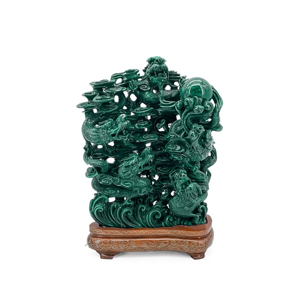 Gruppo in malachite scolpita e traforata a draghi tra nuvole, onde spumeggianti e perla della Saggezza.