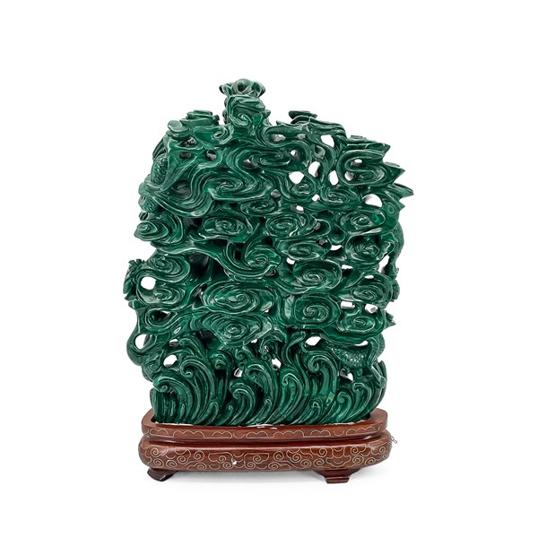 Gruppo in malachite scolpita e traforata a draghi tra nuvole, onde spumeggianti