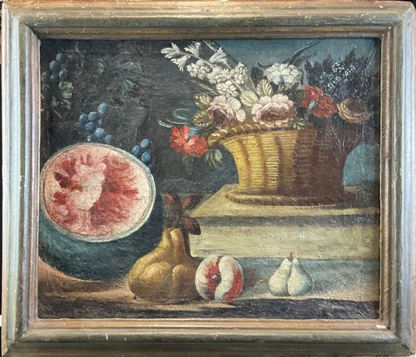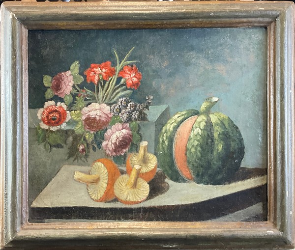 Ignoto"Composizioni con zucca e anguria" coppia di dipinti ad olio su tela (cm