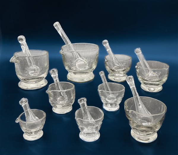 Lot 1313 | Gruppo di dieci piccoli mortai in vetro con pestello di diverse misure (h max c