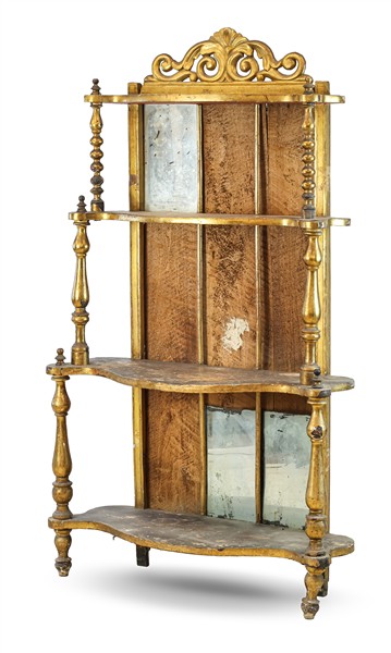 Etagère di forma sagomata in legno intagliato e dorato a quattro ripiani con sostegni torniti e cimasa traforata a volute (cm 90x159x25) (gravi difetti e mancanze)