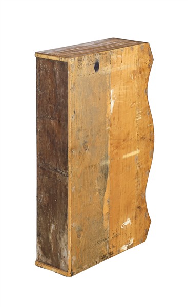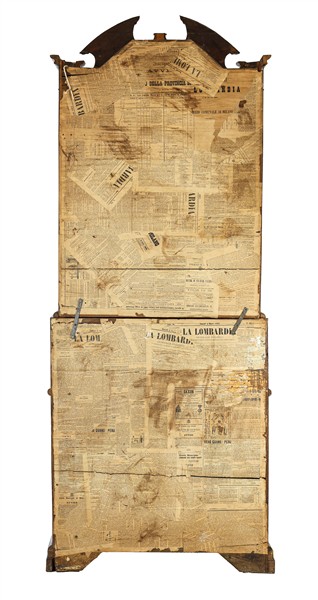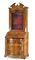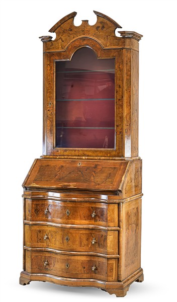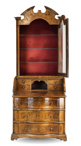 Trumeau lastronato in noce e radica di noce, parte inferiore a tre cassetti su fronte mosso e ribalta celante quattro tiretti e vano a giorno, parte superiore con sportello a vetrina sormontata da cimasa spezzata (cm 91x224x54) (difetti)