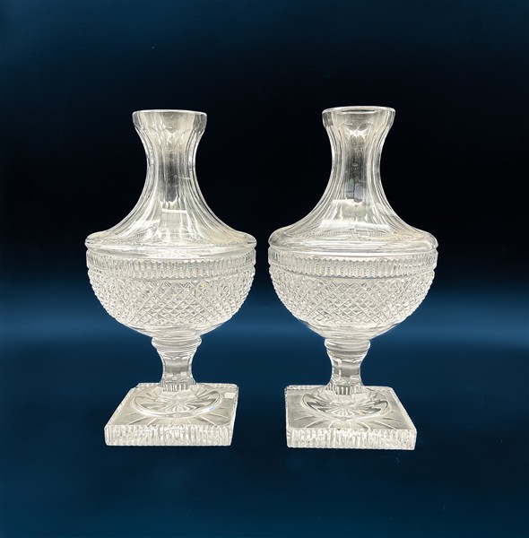 Lot 1323 | Coppia di vasi in cristallo molato con corpo a balaustro su base quadrata e dec