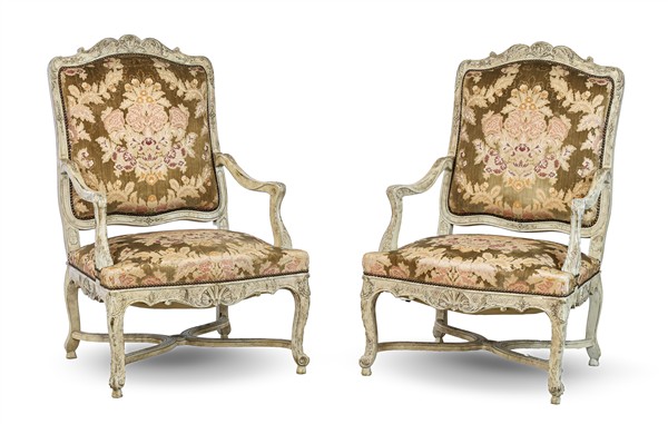 Coppia di poltrone in legno intagliato e laccato di forma sagomata con grembiale e profili a valva di conchiglia, gambe sagomate, raccordate da traversa, piedi terminanti a ricciolo, seduta e schienale in tessuto policromo con decoro floreale borchiato (difetti)