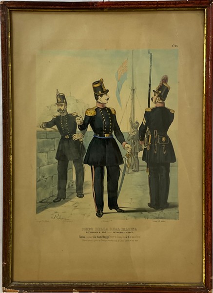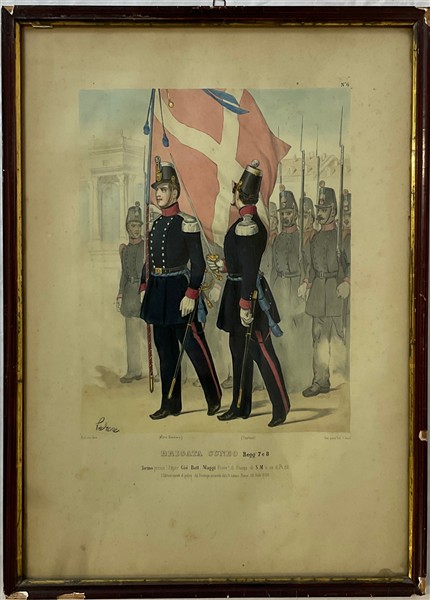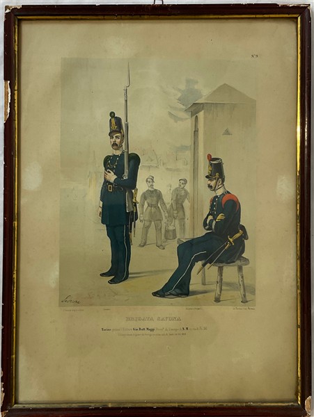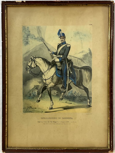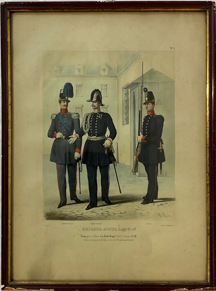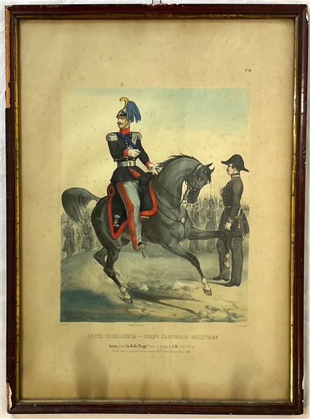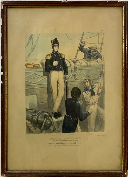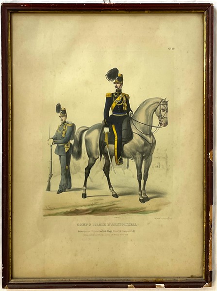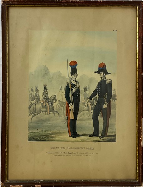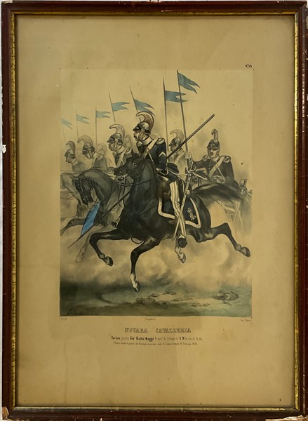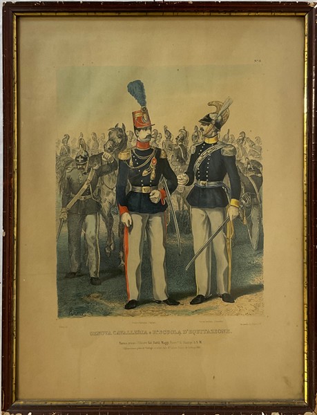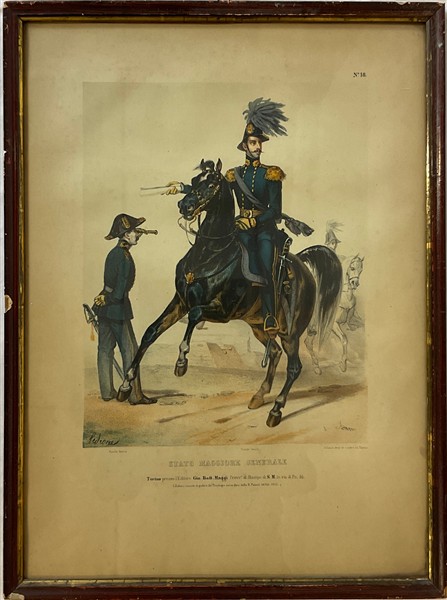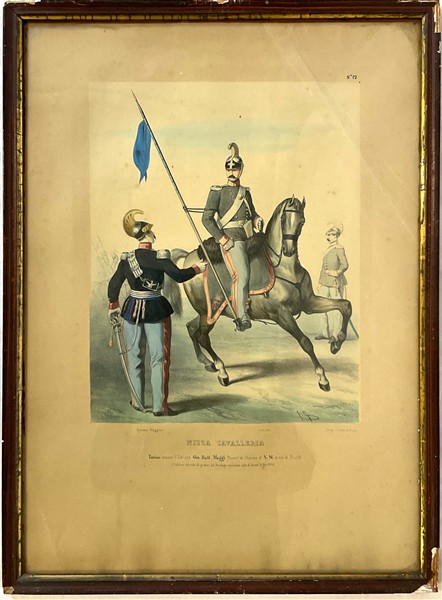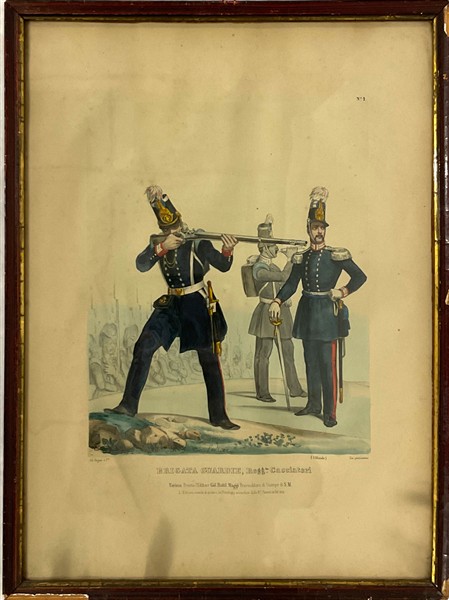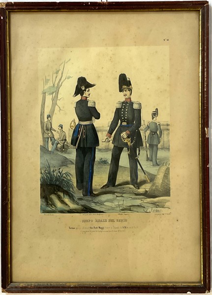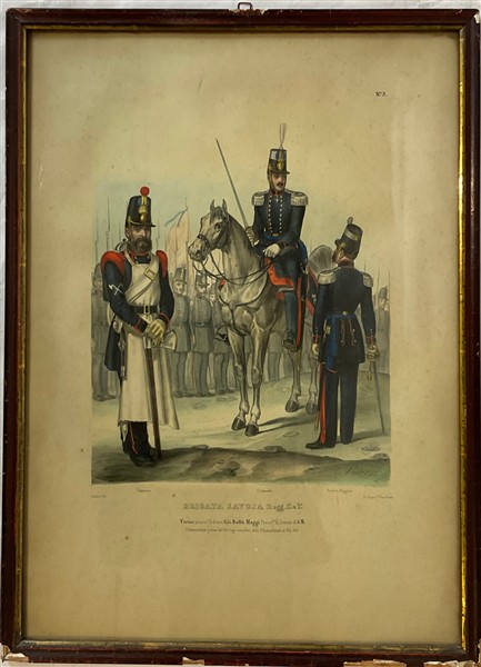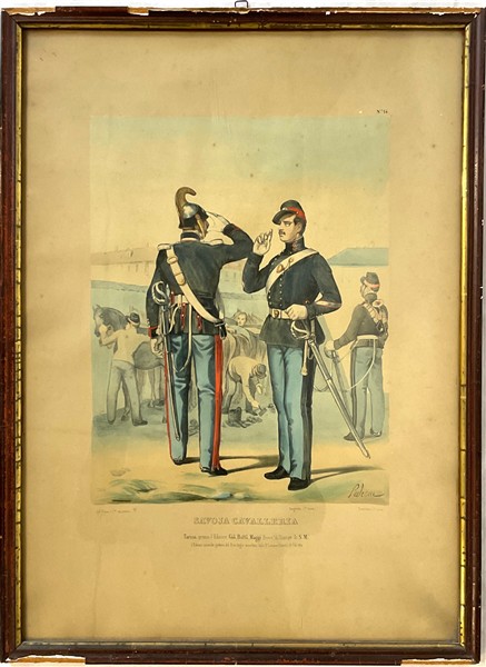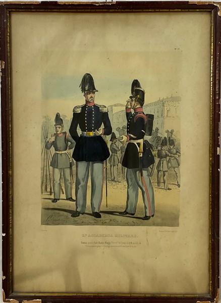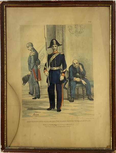 Gruppo di ventidue incisioni a colori del secolo XIX raffiguranti scene di vita militare entro cornici (cm 56,5x42,5) (difetti e rotture)