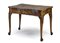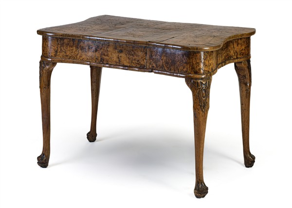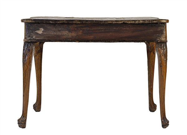 Tavolo da parete in noce lastronato in radica e filettato con piano sagomato e gambe mosse decorate da intagli a foglia. Ferrara (?), secolo XVIII (cm 104x80x74) (difetti e restauri)