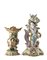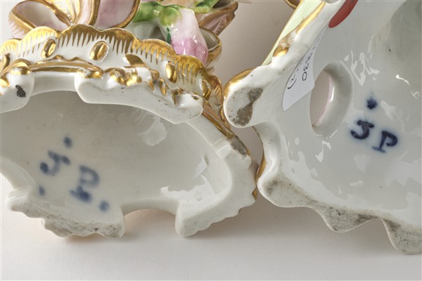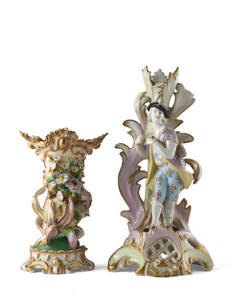 Manifattura Jacob Petit, secolo XIX. Lotto composto da un piccolo vaso in porcellana dipinto in policromia con fiori a rilievo su base rocaille unito a candeliere in porcellana policroma centrato da figuretta. Marcato JP sotto la base (h max cm 26,5) (difetti e restauri)