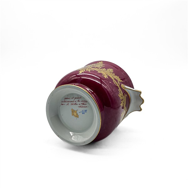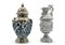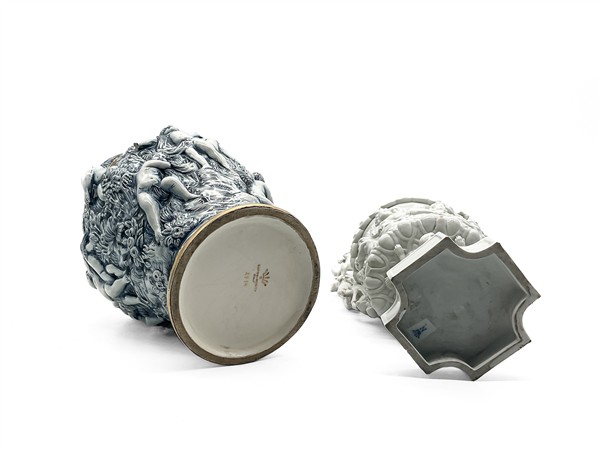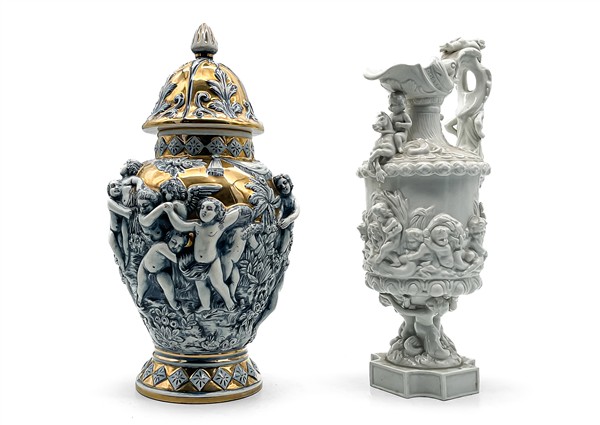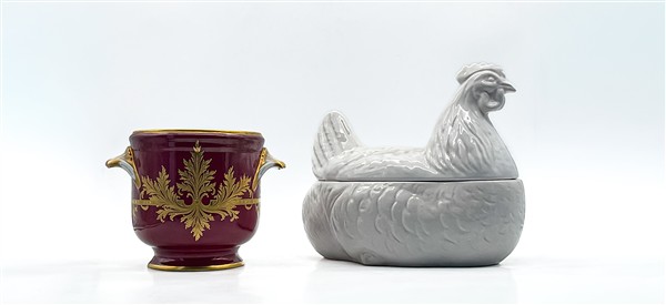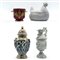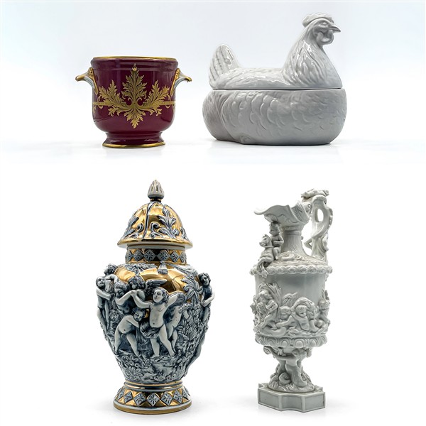 Manifatture diverse, secolo XX. Lotto in porcellana composto da un versatoio bianco con decori figurati a rilievo, cachepot biansato decorato in oro su fondo rosso, potiches con decori figurati a rilievo su fondo dorato e zuppiera con coperchio a forma di chioccia (h max cm 41) (difetti)
