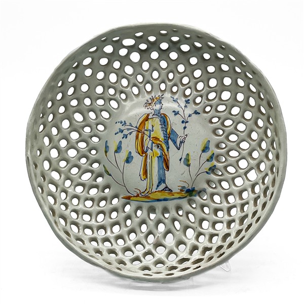 Manifattura di Faenza, secolo XVII. Crespina in maiolica bianca traforata decorata al centro nello stile compendiario in policromia con figura coronata d'alloro (d cm 26,5 h cm 6) (difetti e restauro)