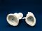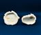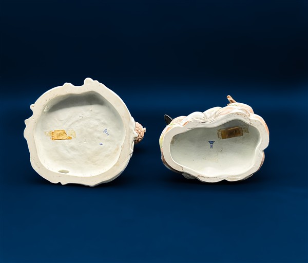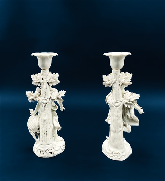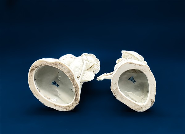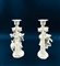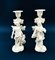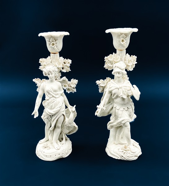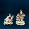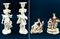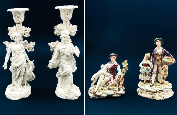 Lotto composto da due gruppi pastorali in porcellana policroma e una coppia di candelieri in porcellana bianca con fusto a figure mitologiche. Marca N coronata in blu sotto la base (h max cm 24) (difetti)