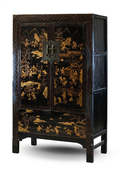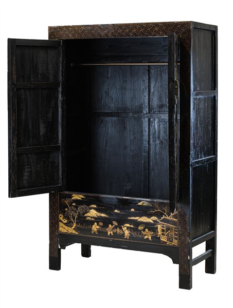Armadio a due ante in legno ebanizzato, laccato e dorato decorato da figure ori