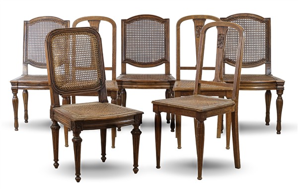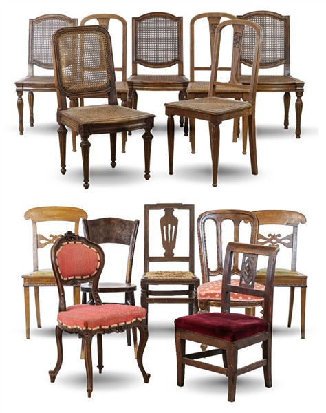 Lotto composto da quattordici diverse sedie in legno, alcune con parti incannuc