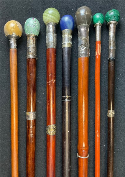 Lotto di sette bastoni da passeggio con ghiere in argento e prese in pietre dur