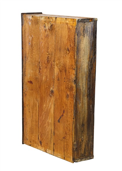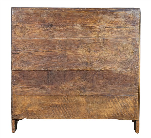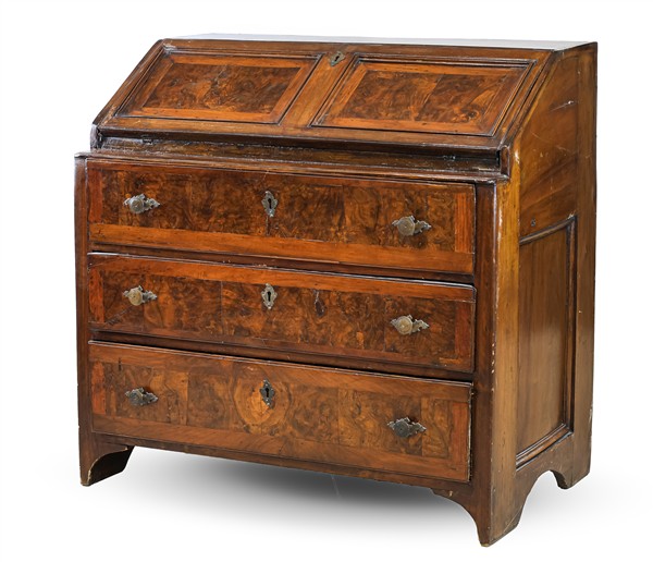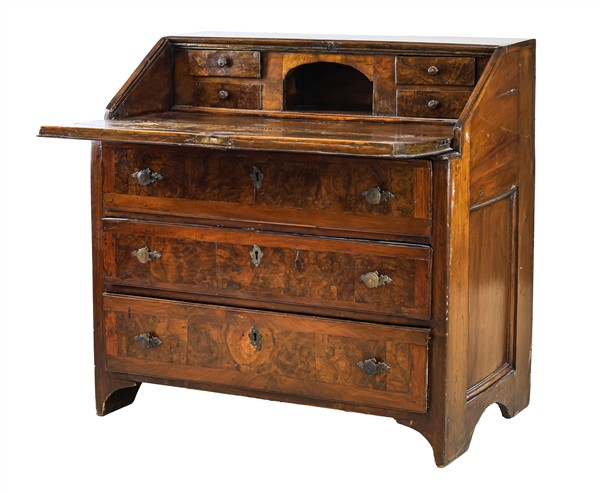Ribalta lastronata in noce e radica con tre cassetti sul fronte e calatoia che rivela quattro tiretti e vano a giorno, piedi a mensola. Realizzata con elementi antichi (cm 103x103x62) (difetti e restauri)