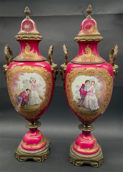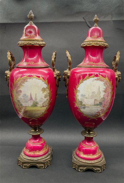 Manifattura francese, secolo XIX-XX. Coppia elementi decorativi a vaso in porcellana dipinta in policromia a scene galanti e paesaggi entro riserva su fondo rosa e bordure in oro. Montatura, prese e anse a volto muliebre in metallo dorato. Marchi di Sèvres in blu.