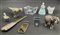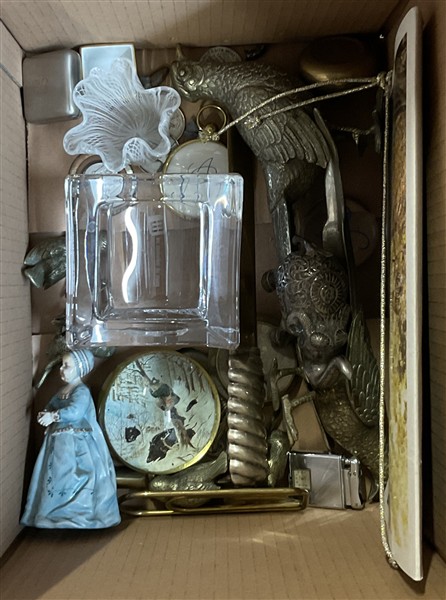 Cartone contenente numerosi oggetti di diversa epoca e decoro tra cui una figur