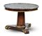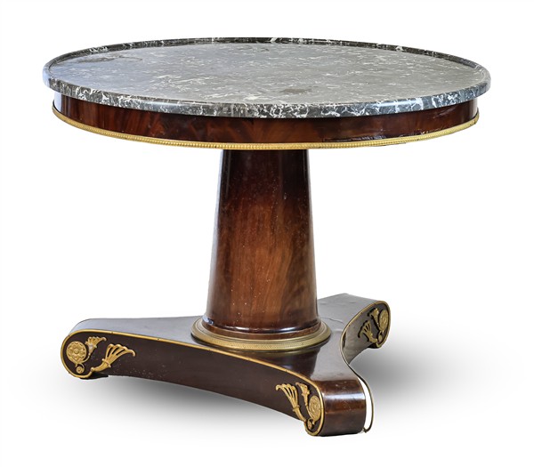 Tavolo da centro impiallacciato in mogano con sostegno a colonna e base tripode, fregi in metallo dorato e piano circolare in marmo grigio, secolo XIX (d cm 97, h cm 73) (difetti)