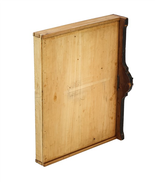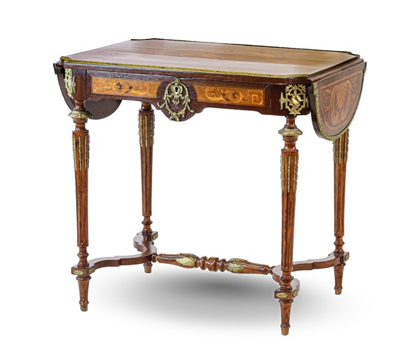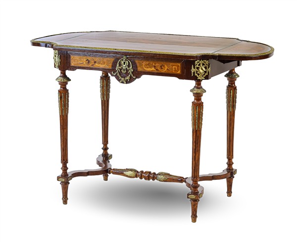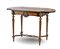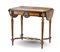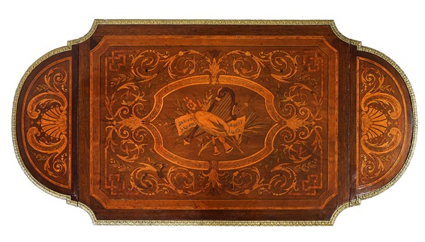 Tavolino da centro a bandelle impiallacciato e intarsiato in legni vari a trofeo di strumenti musicali entro riserva a volute fogliacee e valve di conchiglia, un cassetto nella fascia, gambe scanalate e raccordate da traversa sagomata. Guarnizioni in metallo dorato. Secolo XIX (cm aperto 113x73x57
