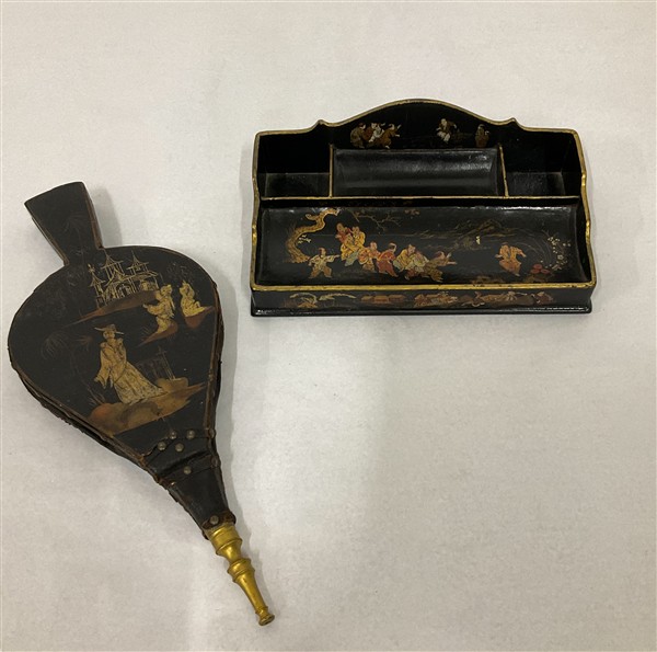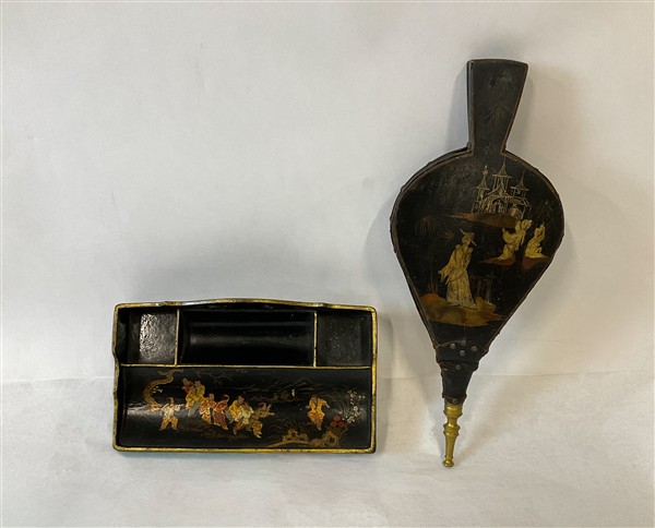 Lotto composto da un soffietto e un calamaio in legno laccato con decori a chinoiserie in policromia e oro su fondo nero. Secolo XIX (l max cm 39,5) (difetti)