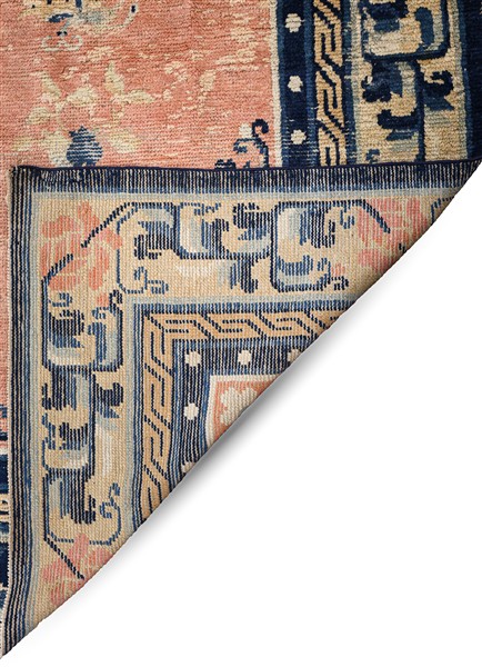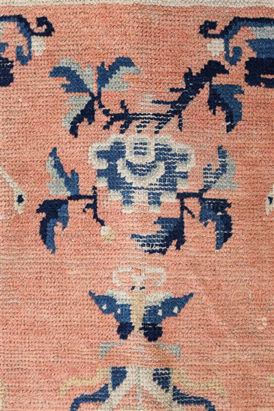 Tappeto Ningxia, Cina, fine secolo XIX. Decoro con medaglione tondeggiante nei toni del blu, azzurro e bianco su campo rosa cosparso di rami fioriti e farfalle (cm 242x160)
