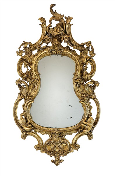 Specchiera con cornice in legno e pastiglia dorata con decori modellati a volute, elementi naturalistici e putti. Secolo XIX (cm 123x72) (difetti, restauri e piccole mancanze)