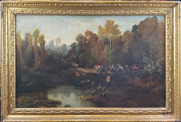 Scuola inglese del secolo XIX "Scena di caccia" olio su tela (cm 50x80) reca