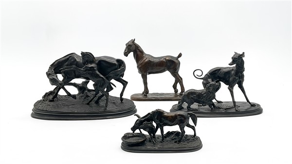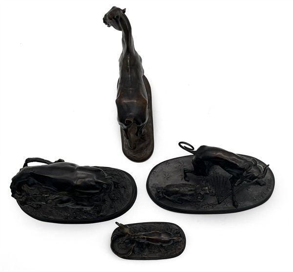 Lotto composto da quattro sculture in bronzo raffiguranti Animali, tre delle quali da P.J. Mene, di diverse misure (cm max 16x25x10) (difetti)