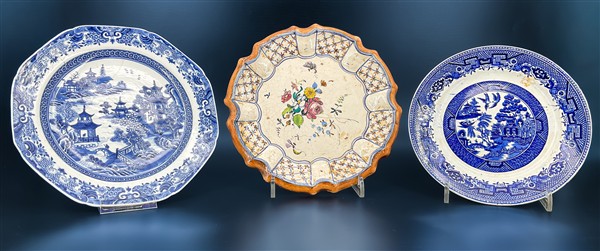 Cartone contenente numerosi piatti e pezzi di forma in porcellana e ceramica di manifatture e decori diversi (difetti e felature)