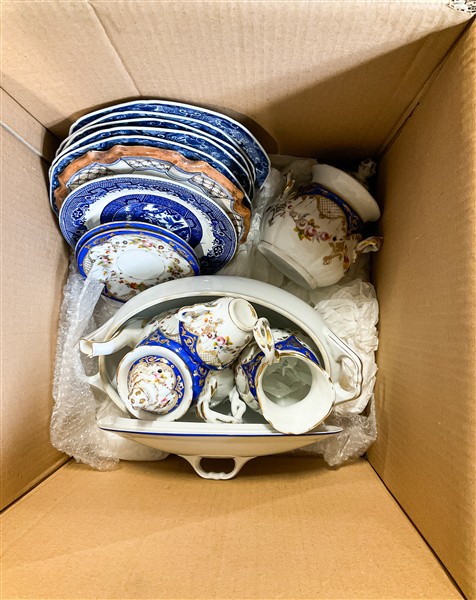 Cartone contenente numerosi piatti e pezzi di forma in porcellana e ceramica di